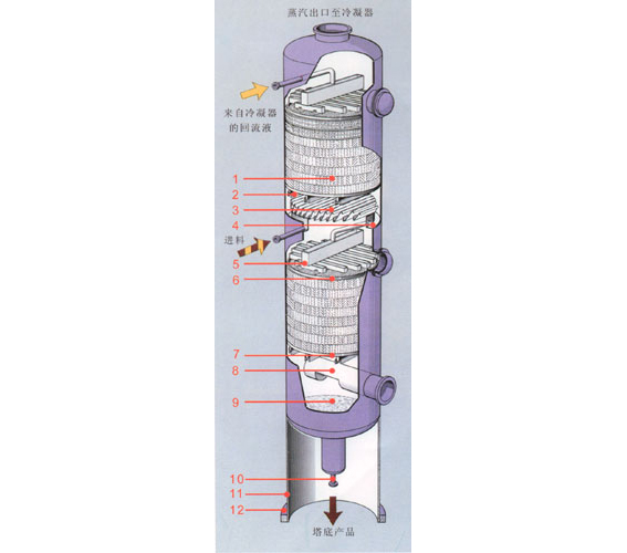 1、規整填料2、支撐柵板3、液體收集器4、集液環5、多級槽式液體分布器6、填料壓圈7、支撐柵板8、蒸汽入口管9、塔底10、至再沸器循環管11、裙座12、底座環此結構適合于直徑大于等于800mm的填料塔。