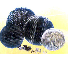 我廠在上;ぱ芯吭褐笇,專業生產新型高效波紋規整填料及散堆填料,可采用不銹鋼、銅 、鋁、純鈦、鉬五鈦、等材質制作。在香料、農藥、精細化工、石油化工等領域得到廣泛應用。 規整填料分為網孔、絲網、孔板、壓延孔板等。 散堆填料主要有:金屬鮑爾環填料、金屬階梯環填料、金屬環矩鞍即金屬英特洛斯填料。